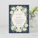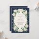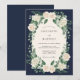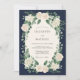 Este design apresenta um rico fundo azul marinho que contrasta lindamente com um arranjo exuberante de rosas creme e delicadas flores de hortênsia. Verduras, incluindo folhas de eucalipto e samambaias plumosas, criam um arranjo floral natural. A paleta de azul profundo, marfim e verde-sage oferece uma estética sofisticada e sombria para qualquer estação.