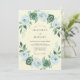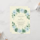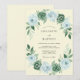 Este design elegante apresenta uma paleta sofisticada de flores verdes esmeralda e azuis-pó contra um fundo de marfim cremoso. Rosas exuberantes e delicados cachos de hortênsias são meticulosamente arranjados com folhagem verde profunda para criar uma estética atemporal. Esses elementos botânicos evocam uma atmosfera refinada perfeita para um evento formal de primavera ou inverno.