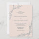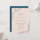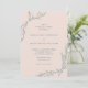 Moderno e chique, mas com a natureza, os convites de casamento, perfeito para as comemorações do jardim. Apresentando folhagem desenhada à mão com folhas e flores em azul marinho contra fundo cor-de-rosa pastel. Uma serifa minimalista e tipografia itálica mostra seus detalhes e nomes de casamento. Inverter para bolinhas simples na parte traseira em contraste com a frente.