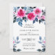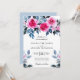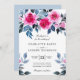 Design de convite para casamento elegante com rosas cor-de-água rosa brilhante, folhagem azul e cinza em fundo branco. O lado inverso do convite está em cor azul empoeirada.