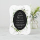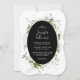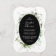Uma escolha sonhadora e etérea nos convites para o casamento, esta delicada design tem um verde de jardim, folhas, samambaias e vinhas em torno de uma estrutura oval preta. Para adicionar ainda uma exclusividade distinta ao design, é usado um estoque de cartão em forma de colchete. Personalize o modelo de texto com os detalhes do casamento. Você pode adicionar ou remover linhas de texto conforme necessário para incluir todos os detalhes importantes.