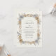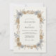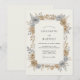 Uma paleta suave de tons de azul poeirento e bronze cria uma estética sofisticada e vintage neste design. Rosas delicadas em aquarela e folhagens exuberantes aparecem em uma disposição densa. O fundo neutro e suave realça o clima romântico, tornando-o ideal para um evento refinado de outono ou primavera.