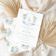 Mergulhe na sofisticação refinada com este elegante convite de casamento francês vitoriano, elegante, com ilustrações graciosas de flores claras, azuis e brancas, formando uma coroa de safra com noiva e dentro de monograma. Uma escolha perfeita para infundir charme em sua celebração de primavera ou verão, este convite captura a essência da beleza clássica.