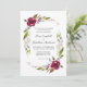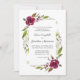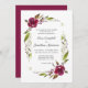 Este convite para o casamento apresenta um elegante gráfico de aquarela de flores cor burgundy acentuadas com folhagem verde sobre fundo branco. O fundo é burgundy.