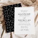 Convites de casamento elegantes e modernos, com detalhes de casamento em letras negras, com caligrafia manuscrita, acentuando a design. Os simples convites de casamento têm um fundo branco. O convite de casamento preto e branco reverte para exibir um lindo padrão foliar. Os convites são perfeitos para casamentos de primavera e jardins de verão.