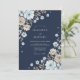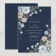 Flores delicadas e acentos folhosos em tons suaves de azul, creme e taupe desfilam sobre um fundo naval profundo. Este design evoca um sentimento romântico e caprichoso, perfeito para uma celebração sofisticada. O arranjo floral sugere uma mistura de anêmonas e flores de preenchimento sutis.
