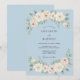 Um fundo suave azul pó define um tom refinado e romântico para este design. Elegantes guirlandas de aquarela de rosas creme e flores de pêssego pálido são combinadas com folhagem de eucalipto verde suave. Esta estética etérea e arejada cria um visual sofisticado para um evento clássico de primavera ou verão.