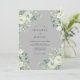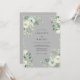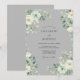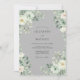 Este design apresenta um sofisticado fundo cinza prateado adornado com delicadas flores em aquarela. Rosas brancas cremosas e folhas de eucalipto dólar de prata criam uma atmosfera serena e elegante. A paleta suave e discreta é perfeita para um casamento refinado de inverno ou primavera clássico. Esta obra de arte captura um senso de graça atemporal através de seus detalhes botânicos pintados.