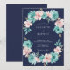 Um fundo azul naval profundo cria um cenário sombrio para este design floral artístico. Suculentas pintadas à mão em tons de azul-verde são combinadas com rosas delicadas cor de rosa desmaiado. Folhagens douradas cintilantes e vegetação suave criam um arranjo botânico exuberante. Esta paleta é perfeita para um evento sofisticado à noite.