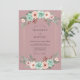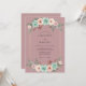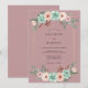 Este design apresenta um rico fundo lilás adornado com elegantes arranjos florais no topo e na base. Rosas macias em verde menta e pêssego estão aninhadas entre folhas verdes sálvia e folhagens mais profundas burgundy para um contraste romântico. O estilo botânico aquarela cria uma estética vintage e sofisticada perfeita para um evento de primavera ou outono.