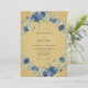 Flores azul-escuras são artisticamente representadas contra um fundo de ócre saturado. Folhas de um verde suave de salva e pequenos botões acentuam as flores maiores para criar uma densa coroa de flora. Esta paleta de cores oferece uma estética sombria, mas elegante para um evento sofisticado. A técnica de aquarela adiciona uma textura pictórica a cada pétala e folha.