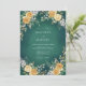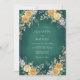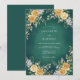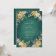 Um fundo verde esmeralda profundo com uma textura suave de aquarela cria um clima sofisticado e atmosférico. Rosas amarelas exuberantes são combinadas com delicadas flores brancas e folhas de eucalipto para uma estética botânica rica. Ideal para um evento formal de inverno ou outono, a paleta equilibra tons de joias ousados com sotaques florais quentes.
