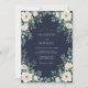 Este design apresenta um fundo azul-marinho profundo que cria um contraste marcante para as rosas brancas cremosas e a folhagem exuberante. O arranjo botânico inclui folhas delicadas de eucalipto e folhagem verdejante, oferecendo uma estética clássica e sofisticada. Ideal para um evento formal noturno, o clima é de elegância atemporal e romance sombrio.