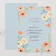 Este design apresenta uma suave lavagem de azul céu como pano de fundo para delicadas flores em aquarela. Papoulas vibrantes em pêssego e anemônias amarelas cremosas estão agrupadas nos cantos, entrelaçadas com raminhos de eucalipto verde-sage. A composição evoca uma atmosfera aérea e romântica, perfeita para um tema botânico de primavera. Flores silvestres azuis sutis e folhagens macias adicionam beleza natural à estética.