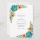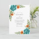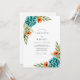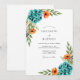 Este design botânico apresenta hidrângeas turquesa vibrantes em aquarela combinadas com papoulas laranja brilhantes. A folhagem verde exuberante cria uma estética natural e arejada perfeita para um evento sazonal. A paleta de cores de aqua profundo e terracota quente oferece um contraste marcante. Ideal para casais que buscam um tema floral elegante, mas colorido.