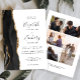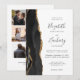 A borda esquerda deste elegante convite de casamento moderno apresenta uma coloração aquosa preta, borda agitada, aparada com falso brilho dourado. O texto personalizável combina a escrita manual de cinzas de carvão, as fontes em copperplate e itálico em um fundo branco. O verso fornece espaços para 5 fotos (3 horizontais 1 quadrado e 1 vertical) e espaço para o seu site de casamento URL ou outra mensagem breve.