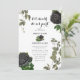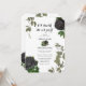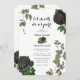 Um design de casamento com rosas pretos e vinhas penduradas no Halloween gótico. Um design branco de Halloween que usa florais botânicos negros e escuros junto com a tipografia da caligrafia de vintage. Um design gótico na moda ideal para temas de casamento de Halloween. Um único design de convite de casamento de rosas negros. Também estão disponíveis itens de papelaria de casamento e outros formatos de convite de casamento.