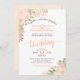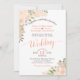 Este convite para o casamento apresenta um design floral de cor d'água rústica com rosas pintados à mão e flores em tons de pêssego e laranja pálido, com folhas de eucalipto folhagem e verde. A inscrição é feita em caligrafia de rico com um fundo branco clássico. A parte de trás do convite é uma cor de pêssego pálida marmoreada, com um buquê de floração e folhagem amarrada com um arco branco.