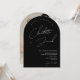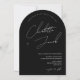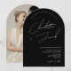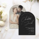 Convide convidados para o seu dia especial com o Convite para Casamento de Fotos do Noivado de Arco de Script Minimalista Moderno Branco Negro! Apresentando um elegante design em forma de arco, um roteiro minimalista e espaço para sua foto de noivado, este convite é perfeito para convites de na moda e casamento personalizados. Perfeito para casamentos de gravata preta.