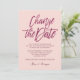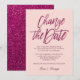 Anúncio de adiamento ou mudança de data do casamento glamoroso com uma fonte de caligrafia glitter trendy que diz "Mude a data" em roxo brilhante luxuoso para informar seus convidados sobre o adiamento ou cancelamento do seu casamento e novos planos,