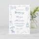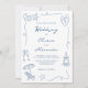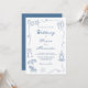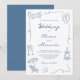 Este convite de casamento divertido e excêntrico em azul poeirento e branco apresenta uma moldura ondulada com desenhos de praia desenhados à mão e tipografia manuscrita. O design de casamento costeiro elegante, mas casual, é perfeito para casamentos à beira-mar e em destinos.