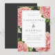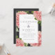 Um convite de casamento em estilo vintage com um design floral sombrio na moda. Este design apresenta peônias rosa em estilo botânico em aquarela com folhas verdes, em um fundo de carvão. O texto em carvão é em um quadro duplo branco contrastante. O verso é em carvão sólido.
