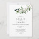 Este convite casual para o casamento é perfeito para um casamento de boho. O design rústico, porém elegante, apresenta folhas botânicas de cor aquática simples e azeitonas pretas num pequeno galho com um toque mediterrânico clássico.