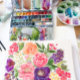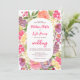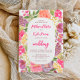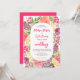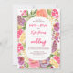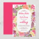 O convite de casamento chic com guião floral brilhante boêmio, com bonito mão pintada com flores brilhantes e ousadas modernas, mistura uma sensação vintage, com corais, flores roxas, rosas rosa e verde com uma celebração de festa de casamento botânica. Com uma tipografia moderna e néon rosa.