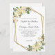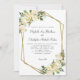 Elegante, o convite formal de casamento apresenta rosas românticas de casamento em branco de baunilha com cores brancas com pincéis de cor pincelada mostrados em folha verde em um fundo branco nítido. Uma moldura geométrica de cor de ouro cintilante em forma de cristal fornece um toque de tendência. A formulação tradicional e clássica proporciona sofisticação ao eterno. Personalize a design do casamento com seus detalhes em cinzas elegantes e roteiro. A parte de trás do cartão é um branco elegante e nítido. Pode entrar em contato comigo em invitationsuites@gmail.com se tiver perguntas sobre este ou qualquer dos nossos designs.
