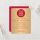 Um design contemporâneo que apresenta o caráter chinês "Felicidade dupla" como um carimbo circular. O termo "Dupla Felicidade" escrito xi ou "hsi" em mandarim e pronunciado "shuang-xi" é um conhecido personagem chinês usado tradicionalmente no casamento chinês como símbolo de amor, felicidade e sorte para o recém-casado casal. A cor vermelha é uma cor auspiciosa e uma cor popular na cultura chinesa. Ele simboliza sorte, felicidade e alegria. O uso do ouro como cor de fundo traz prosperidade e sucesso na união. Um design verdadeiramente ajustado para qualquer celebração de casamento chinesa.