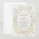 Um delicado arranjo de aquarela de rosas creme e flores azuladas suaves define este design sofisticado. Folhas de ouro discreto e folhas de eucalipto criam uma exibição exuberante contra um fundo marfim. A paleta de champanhe e cerúleo empoeirado evoca um clima atemporal e romântico para uma cerimônia tradicional.