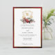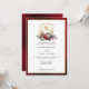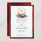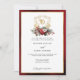 Eterno de casamento elegante e elegante, mas festivo, com o tema das férias, apresentando a crista floral de ouro clássico desenhado à mão, acentuado por um spray colorido de flores e verduras de Natal vermelhas e brancas. Este modelo formal personalizado inclui campos de texto editáveis, além de gráficos de texto de caligrafia personalizados e borda dourada. A borda externa e traseira apresenta um fundo de textura de veludo vermelho opulente e rubi.