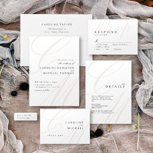 Os convites modernos clássicos de casamento minimalistas apresentam detalhes elegantes de monograma de caligrafia casal e eterno serif em bege editável a cores, preto e branco, simples e sofisticado, Excelente para casamento vintage formal, casamento tradicional romântico, casamento clássico moderno em todas as estações. Veja todas as peças correspondentes na coleção.