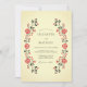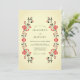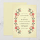 Este design evoca uma estética cottagecore quente e tradicional com seu arranjo floral simétrico. O fundo de marfim cremoso fornece uma base suave para as rosas vermelhas vibrantes e folhagens verde-escuras. Delicadas bagas vermelhas e folhas escuras complementam as rosas em flor para criar um visual botânico vintage. Ideal para um evento nupcial rústico de outono ou no campo aconchegante.