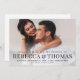 Uma camada moderna com grandes nomes e uma foto de sangria de cheio são as características deste convite de casamento. Coordena o convite adicional e o dia dos itens com esta design visitando a Coleção de Casamentos de Sobreposição Moderna por Stacey Meacham.