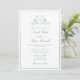 Aprecie amigos e família com este elegante convite de casamento mostrando um belo monograma botânico de folha desenhada com noiva e iniciais de noivo. O convite à frente foi cortado com matizes de cor verde-claros, finos, enquanto que o convite apresenta as costas com uma bela lavagem a aquarela em matizes verdes claros e claros. Cheio simples e limpo de elegância e graça com detalhes de caligrafia escritos à mão. Capacidade de mudar "juntamente com os seus pais" para "junto com as suas famílias", "juntamente com a alegria do excelente", "juntamente com o prazer do excelente"... Se preferir o convite de volta em branco, pode fazer esta alteração seguindo estas etapas: clique no botão azul "Editar Usando a Ferramenta Design" localizado no final das caixas de texto modelo. Em seguida, na camada "traseira", adicione de "elementos" no menu à esquerda, um quadrado. Arraste os cantos com o rato e faça-o grande cobrindo as costas inteiras. Em seguida, mude a cor do quadrado para branco no menu à direita. Finalmente, clique no botão "concluído" no canto superior. Isso fará todo o convite ficar branco. Mesmo design sem detalhes de caligrafia também disponível. Parte da nossa coleção "Pale Green Watercolor, Botanical Monographic Wedding" com uma variedade de produtos coordenadores disponíveis. Visite toda a coleção com este link: https://www.zazzle.com/collections/pale_green_watercolor_botanical_monogram_wedding-119012131862745496