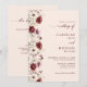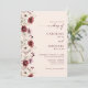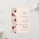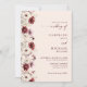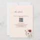 Convite de casamento com caligrafia elegante, script borgonha com design de flor silvestre, código QR e mais informações detalhadas no verso.