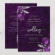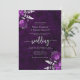 Este convite de casamento elegante apresenta ramos florais de ameixa realçados com folhagem prateada em fólio falso em dois cantos, sobre uma imagem de fundo de ágata de cor púrpura-ameixa em aquarela. O verso fornece espaço para detalhes do casamento, juntamente com um código QR que os convidados podem escanear para visitar seu site e responder, o que economiza o custo de impressão e envio de cartões de resposta separados.