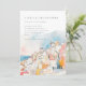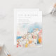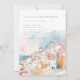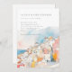 Convite mediterrânico colorido moderno para Casamento, com uma bela coloração d'água, encosta e paisagem costeira, cor-de-rosa, azul e laranja, sobreposta com a fonte da cinza moderna. Adicione seu código QR de casamento ao contrário.