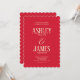 Faça uma declaração com este convite de casamento moderno e divertido, desenhado em uma matiz vermelha impressionante com tipografia ousada e uma borda escalpada divertida. Perfeito para casais que querem seu grande dia para se destacar desde o início, este design atraente combina o estilo contemporâneo com um toque de capricho. É uma maneira nova e inesquecível de convidar seus convidados para celebrar seu amor. Itens correspondentes disponíveis.