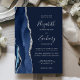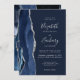 A borda esquerda deste elegante convite de casamento moderno apresenta um marinho azul de aquarela agata bordada com falso brilho prateado. O texto personalizável combina escrita manual, placa de impressão e fontes itálicas em cinzas prateadas leves em um fundo azul marinho. O verso apresenta um design azul marinho e agate prateado correspondentes.