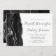 A borda esquerda deste elegante convite de casamento moderno apresenta uma coloração aquosa preta e borda agitada com falso brilho prateado. O texto personalizável combina manuscrito, copperplate e fontes itálicas em cinzas de carvão em um fundo branco. O verso apresenta um design de agata preto e prateado correspondente.