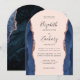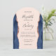 Este elegante convite de casamento moderno em forma de arco apresenta marinho azul de aquarela agata bordas laterais aparadas com falso brilho de rosa. O texto personalizável combina a escrita manual de cinzas de carvão, fontes em copperplate e itálico em um fundo cor-de-rosa pincelado. O verso apresenta um design marinho de agate azul e rosa dourado correspondente.