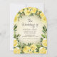 Rosas amarelas/aquarela floral e folhagem com brilho de ouro brilhante, convite de casamento em forma de arco botânico com texto, "O casamento de" escrito em uma elegante letra manuscrita. Entre em contato comigo para obter assistência com suas personalizações ou para solicitar outros produtos Zazzle correspondentes ou coordenadores para seu(s) evento(s)