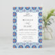 Lindo padrão de moldura de azulejo geométrico espanhol azul e ferrugem, convite de casamento. A parte de trás do convite apresenta uma cor ferrugem sólida e moderna. Os estilos e cores das fontes podem ser personalizados.