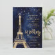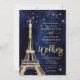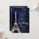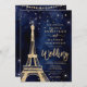 Um casamento romântico moderno, chico e glamouroso do tema Paris com uma torre Eiffel francesa desenhada a ouro com brilho dourado com faíscas de diamante reluzente em uma cor azul-marinho escura. Perfeito para o casamento de destino europeu.
