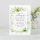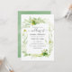 Convite de casamento verde que inclui samambaias, flores silvestres e morangos e um fundo de lavagem de cor verde-aquosa.