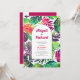 Folhas tropicais coloridas maximalistas e convite para casamento em arco com código QR. Este vibrante e animado convite de casamento apresenta uma impressionante mostra de folhas tropicais coloridas maximalistas e um elegante design de arco. O convite é enfeitado com um belo padrão de folhas tropicais em tons de verde, laranja, roxo e magenta rosa, criando um design visualmente impressionante e atraente para os olhos. O texto personalizado é elegantemente enquadrado dentro do arco, com os nomes do casal mostrados em tipografia ousada, servindo de ponto focal cativante. No verso do convite, uma banda branca vertical apresenta orgulhosamente as iniciais do casal feliz e um código QR para RSVP on-line.