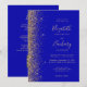A borda esquerda deste elegante convite de casamento moderno apresenta um design dourado falso. O texto personalizável combina uma letra pálida de cor dourada, uma letra copperplate e uma letra itálico num fundo azul real. O verso fornece espaço para detalhes do casamento em um sólido fundo azul real, junto com um código QR que os convidados podem digitalizar para visitar seu site e RSVP, o que economiza o custo de imprimir e enviar cartões RSVP separados.