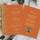 A borda esquerda deste elegante convite de casamento moderno apresenta um design dourado falso. O texto personalizável combina manuscrito pálido de cor dourada, fontes copperplate e itálico em um fundo laranja queimado. O verso fornece espaço para detalhes do casamento em um fundo sólido, junto com um código QR que os convidados podem digitalizar para visitar seu site e RSVP, o que economiza o custo de imprimir e enviar cartões RSVP separados.